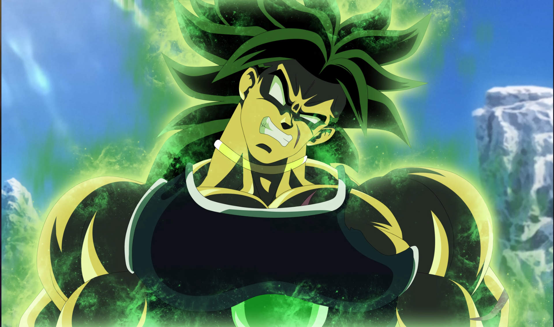 Transformasi Wrathful Broly menampilkan kemarahan dan kekuatan yang tak terkendali. Mata hijau menyala dan aura kehijauan yang menyelimuti tubuhnya menciptakan wallpaper yang intens dan dramatis.
