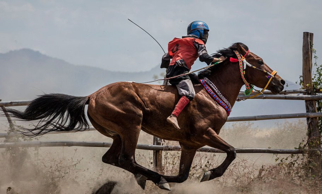Wallpaper dengan tema kuda dan joki di tengah balapan menghadirkan nuansa dinamis dan dramatis. Debu yang beterbangan, ekspresi joki yang fokus, dan kuda yang berlari kencang, menciptakan wallpaper yang penuh energi dan semangat kompetisi.