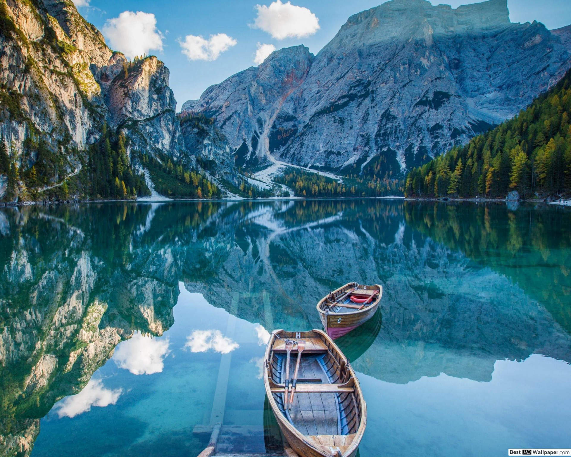 Wallpaper bertema pegunungan dengan danau yang tenang memberikan suasana damai dan menenangkan. Bayangkan hamparan air yang jernih berlatar pegunungan megah, menciptakan kombinasi visual yang sempurna untuk layar perangkat Anda.