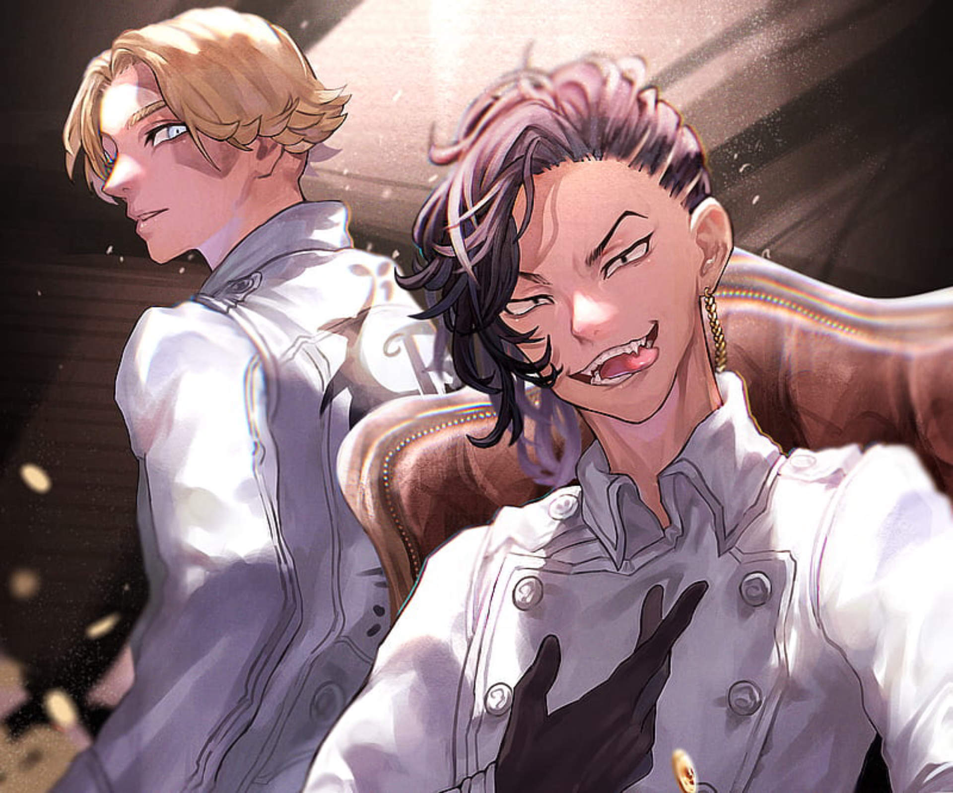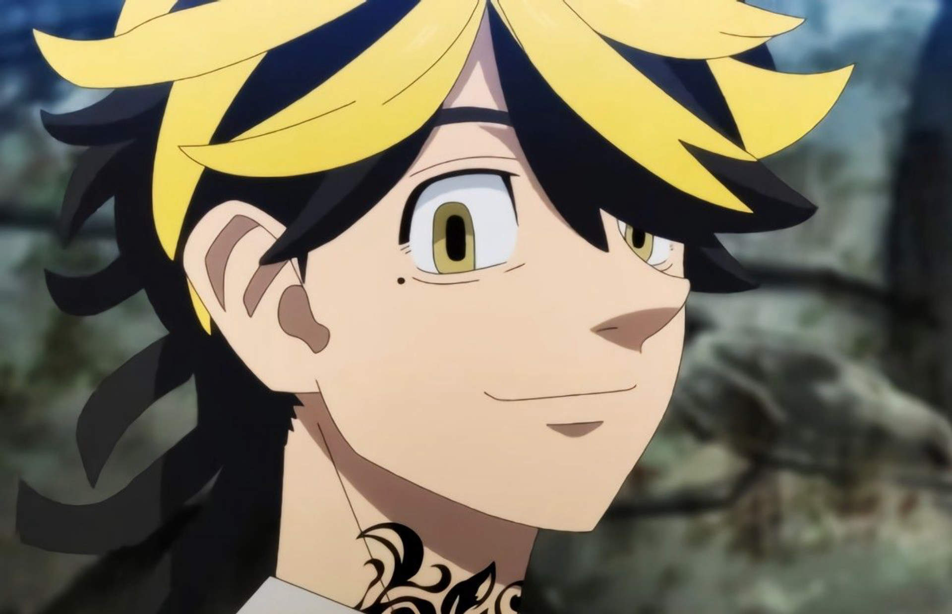 Latar belakang gelap memberikan kontras dramatis, menyorot ekspresi dan tato khas Kazutora. Hal ini memperkuat aura mengancam sekaligus rapuh yang menjadi daya tariknya.